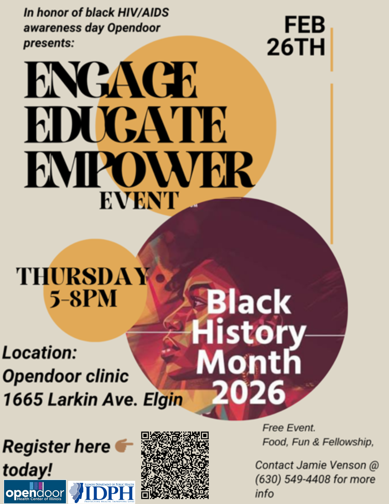 Open Door Health Center of Illinois Elgin Office 1665 Larkin Avenue, Elgin, United StatesJoin Open Door Health Center of Illinois as we honor Black HIV/AIDS Awareness Day and celebrate Black History Month 2026! This special "Engage, Educate, Empower" event is dedicated to uplifting our community through meaningful conversation, education, and fellowship. 📅 Date: Thursday, February 26th, 2026 ⏰ Time: 5:00 PM – 8:00 PM 📍 Location: Open Door […]