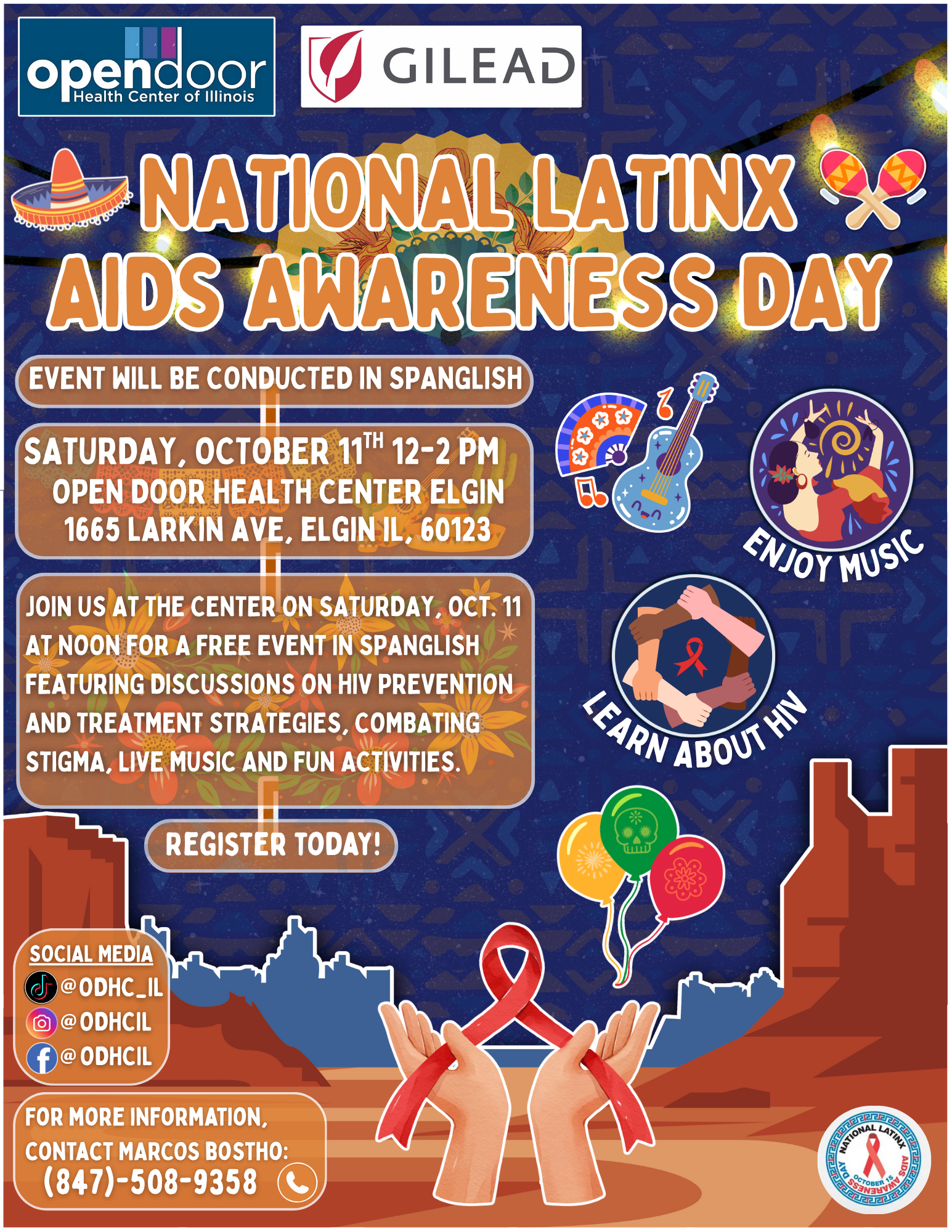 Join us at the center on Saturday, Oct. 11 at noon for a free event in Spanglish featuring discussions on HIV prevention and treatment strategies, combating stigma, LIVE music and fun activities.